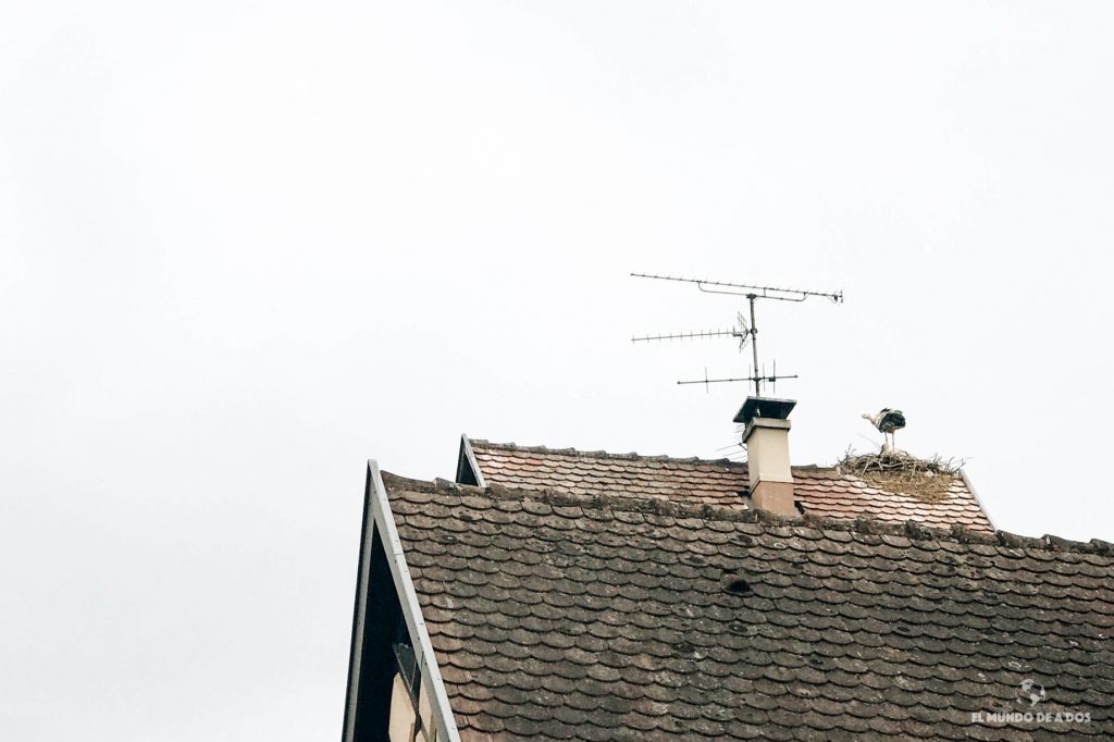 Una de las cosas que más nos llamaron la atención de Eguisheim es que todas sus torres y edificios altos están coronados por un nido de cigüeñas.